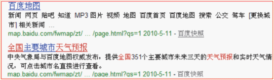 例子中的網頁,提供全國主要城市的天氣預報服務,第一個結果中,使用了百度地圖默認的t i t l e ,用戶在搜索結果無法判斷這個網站提供的內容是什么,也就不會點擊這個結果,第二個結果中,t i t l e 很明確的寫明了所提供的內容,用戶判斷起來比較容易,選擇這個結果的可能性比較大。